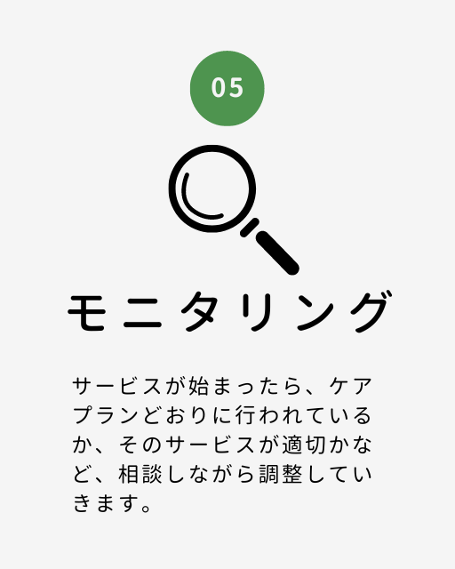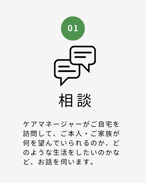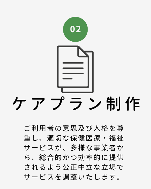 介護支援専門員は、ご利用者の心身状況、その置かれている環境に応じて、そのご利用者が可能な限りその居宅において、有する能力に応じ自立した日常生活を営むことができるよう、ご利用者の立場にたって援助を行います。